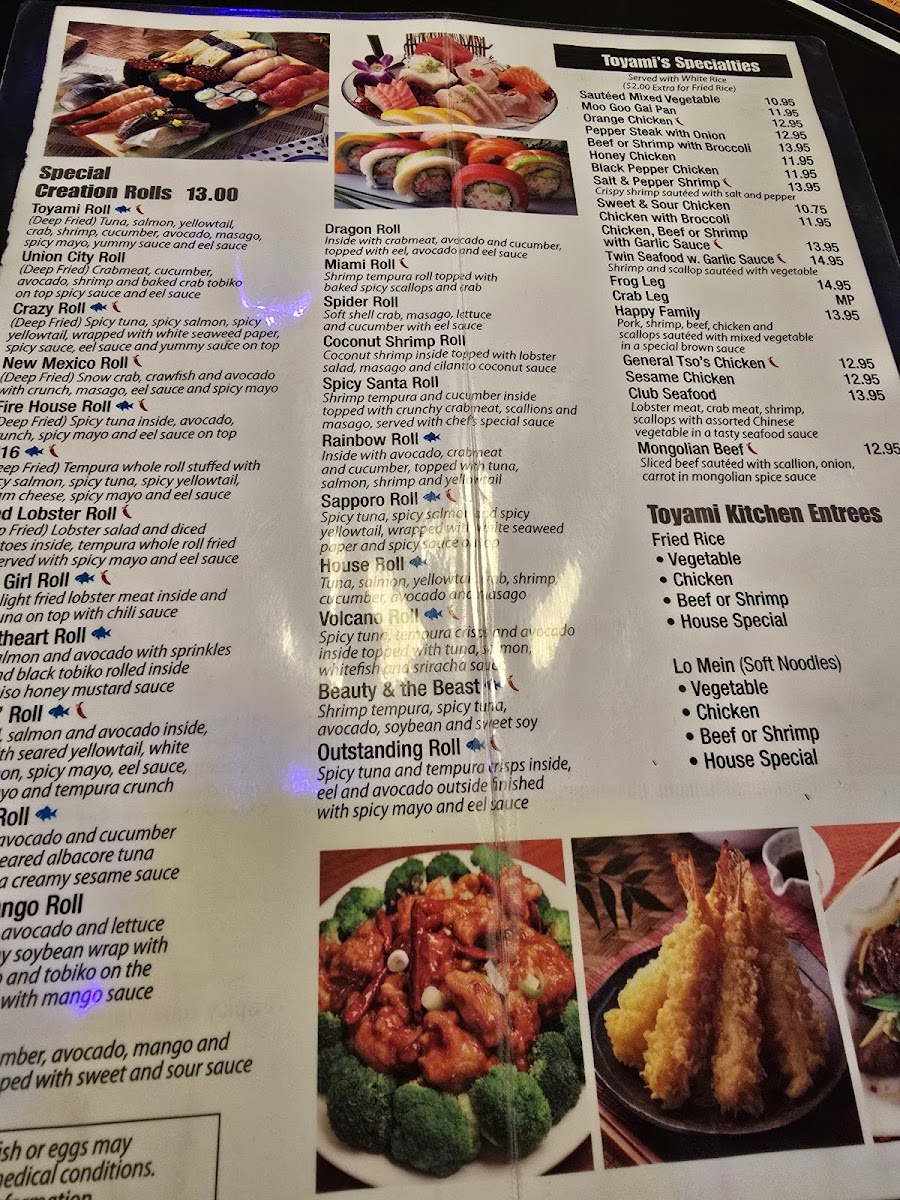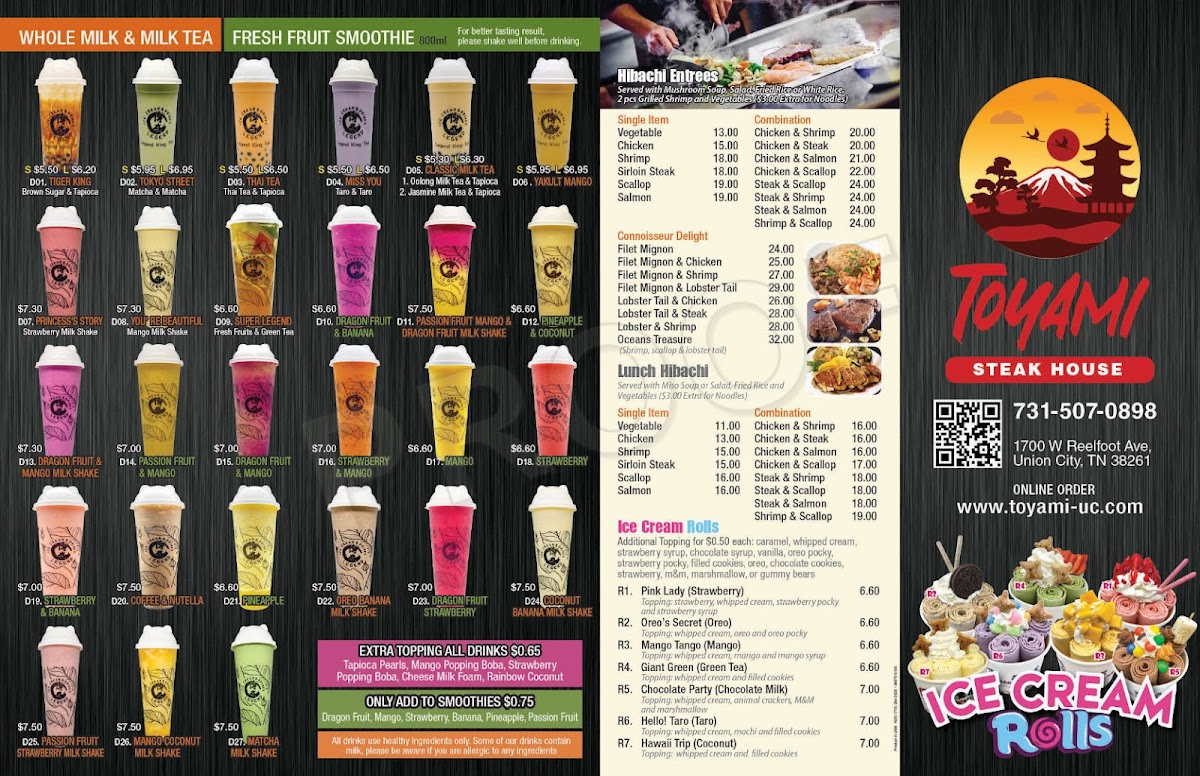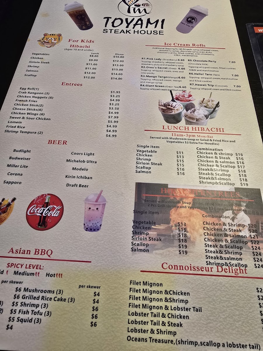 At Toyami Steak House Menu, you'll find a delightful blend of flavors, offering something for every taste. Located at 1700 W Reelfoot Ave, Union City, TN, this cozy spot serves up juicy steaks, tender cuts, and a variety of sides that will make your meal truly memorable. From perfectly grilled steaks to flavorful seafood options, every dish is made with fresh ingredients and expert seasoning. The menu features everything from hearty, melt-in-your-mouth ribeyes to sizzling filets, along with a selection of mouthwatering appetizers, crisp salads, and savory sides that pair perfectly with your main course. Whether you're here for a casual meal with friends or a special night out, Toyami Steak House delivers comfort food with a touch of elegance that’s sure to satisfy your cravings.